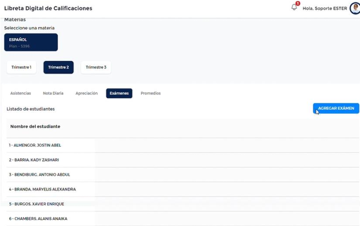 Este proceso es parecido al de notas diarias. Le damos clic al signo + para agregar los datos referentes a los exámenes.