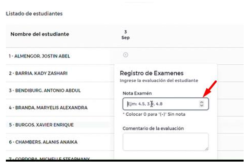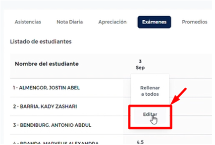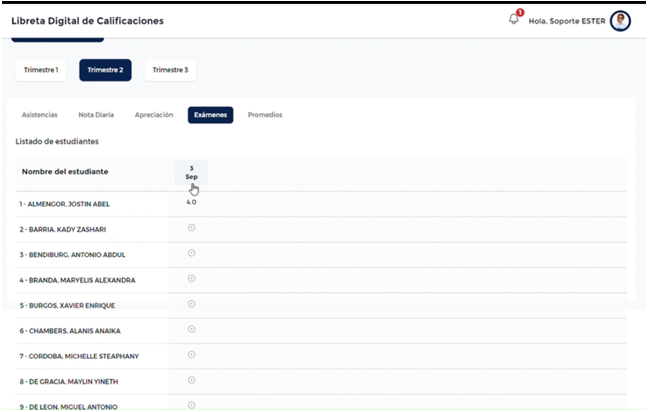 Podemos observar que aparece la columna con la fecha del examen y las evaluaciones insertadas de cada uno de los estudiantes.
