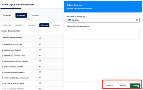 En el nuevo menú se puede reemplazar la fecha de la evaluación y la descripción o se puede eliminar con los botones de abajo.